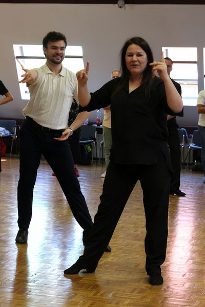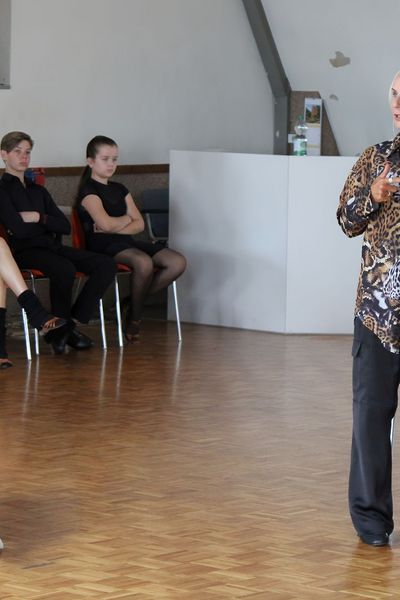 Hilfreich zur Veranschaulichung der Themen waren auch die eingeladenen Lateinturnierpaare, welche überzeugend darstellen konnten, daß zu wenig Energie zum „Modell süßer Schlumpf“ führt, auf der anderen Seite aber zunächst zu klären ist „wo die slows sind, damit daraus die quicks entwickelt werden können“ (Manuela Faller).