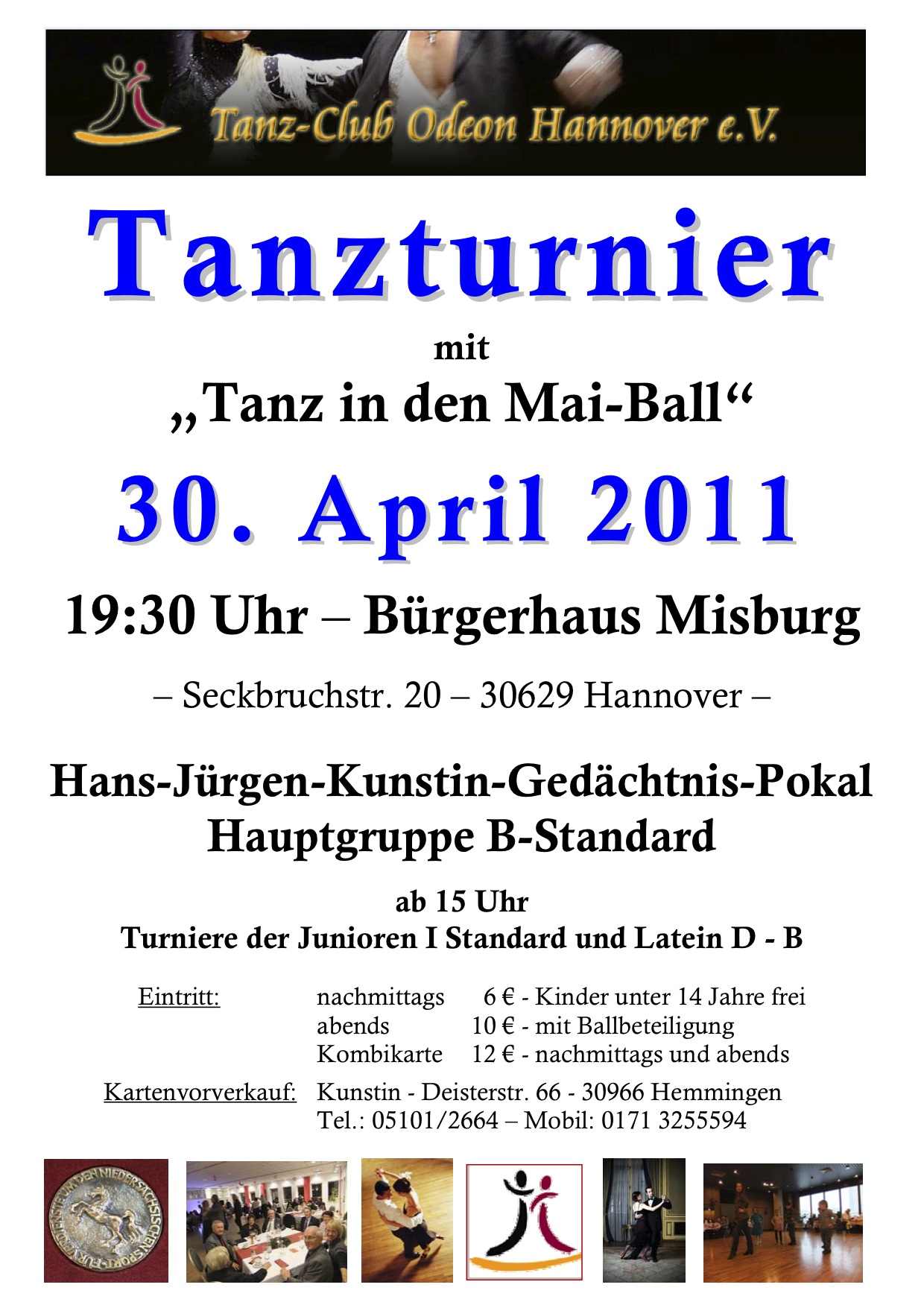 Am 30. April d. J. findet im Bürgerhaus Misburg der zweite Hans-Jürgen Kunstin Gedächtnispokal statt. Ab 15.oo Uhr gehen die Paare der Junioren I D bis B Standard und Latein an den Start und um 19.3o Uhr im Rahmen des Ballprogrammes sind die Paare der Hauptgruppe B Standard zu sehen, für die auch ein Preisgeld ausgelobt wurde. Meldungen werden noch entgegen genommen. Bitte melden Sie sich unter: